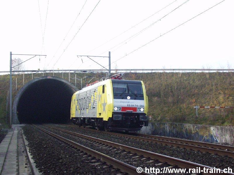 Quelques minutes plus tard, c'est au tour de la ES 64 F4 - 002, calquée sur la BR 189 allemande, en livrée Dispolok de sortir du même tunnel dans la même direction que la ES 64 F4 - 094. |
